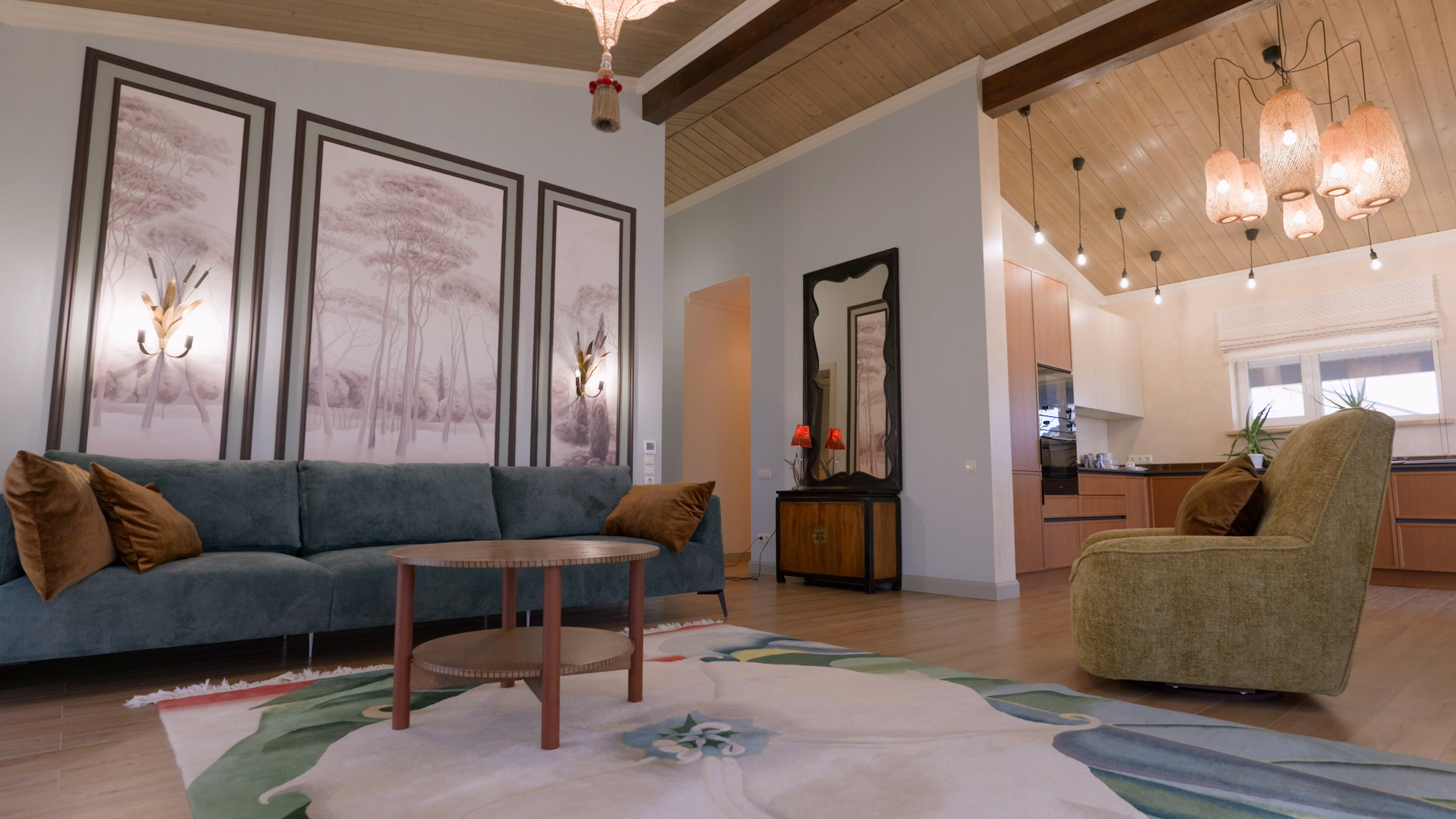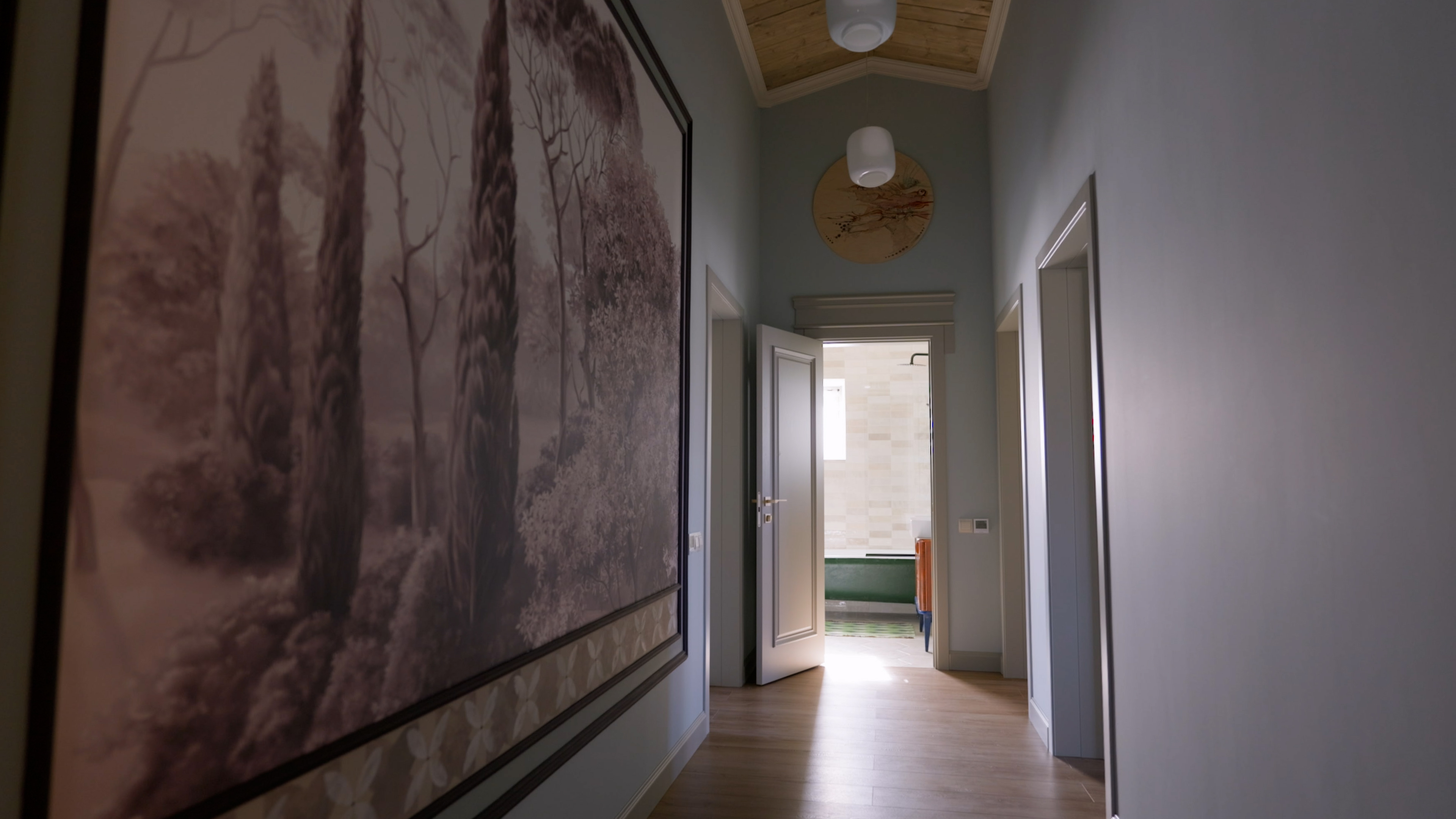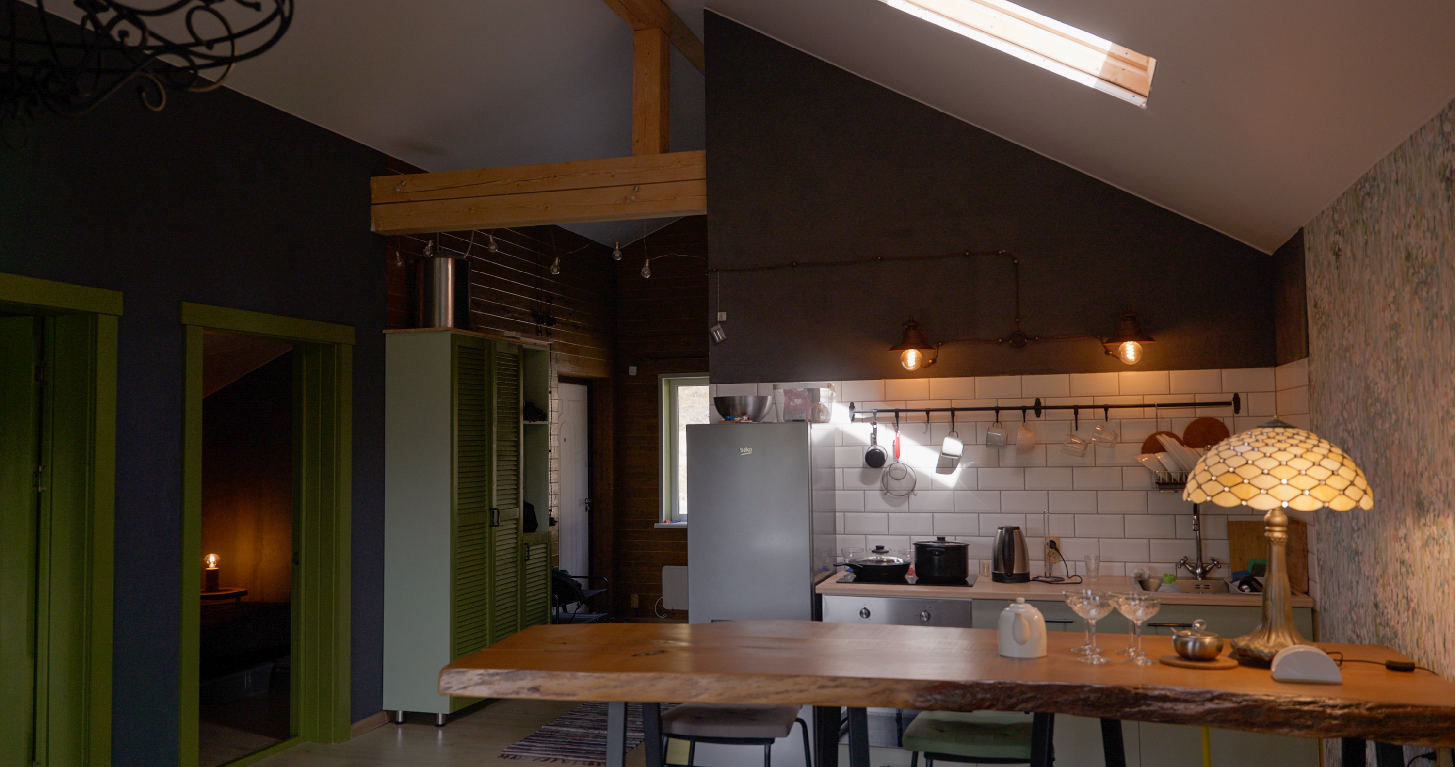 Чистовая отделка в стиле ЛОФТ. Декоративная штукатурка "Арт бетон", укрытие маслом деревянных элементов, керамогранит в мокрых зонах, установка межкомнатных дверей.