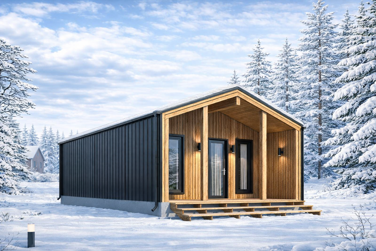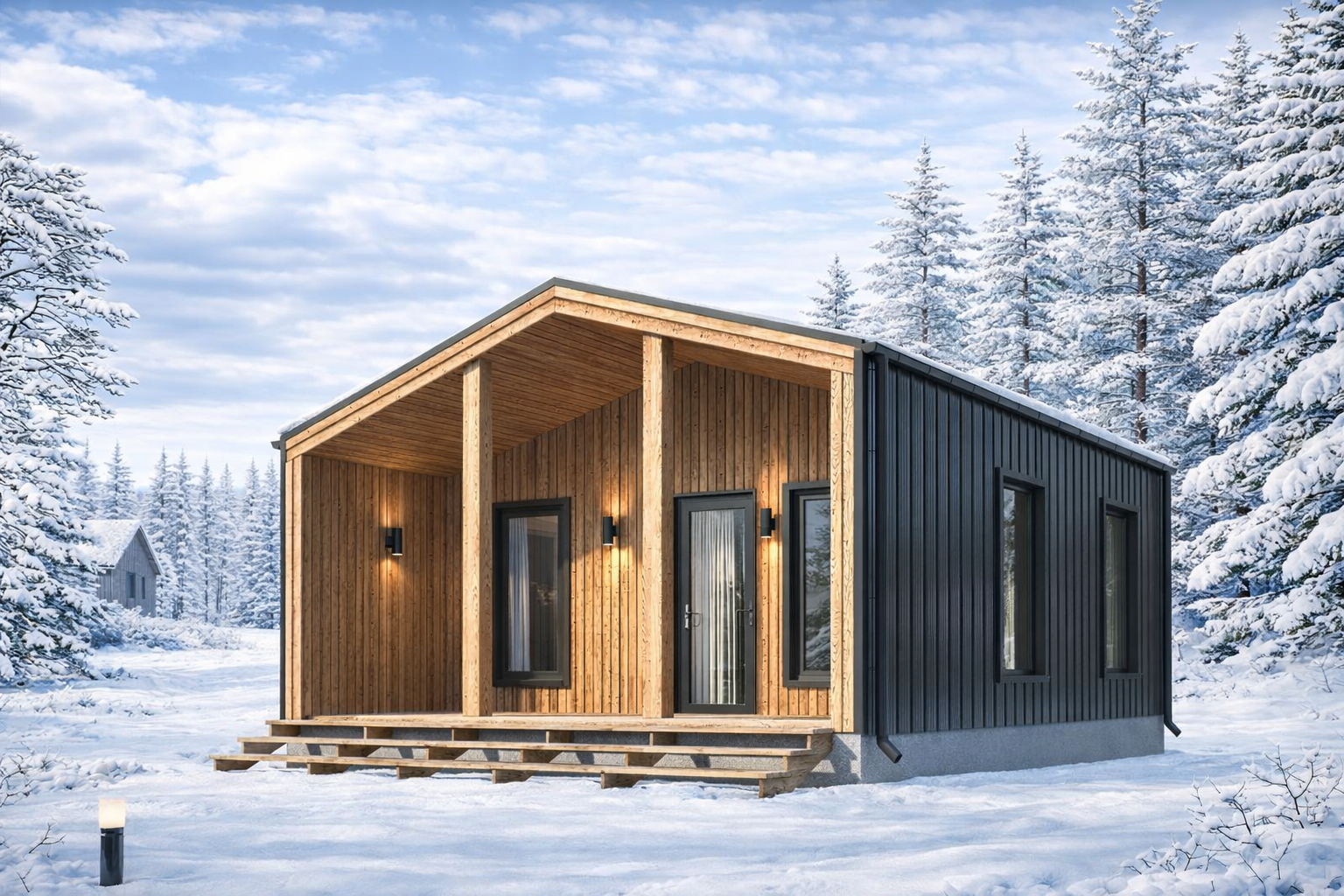 Сборка силового каркаса и стропильной системы из сухой строганной доски 145х45. Боковой фасад и кровля выполнены из профлиста ст 15 или нс 35, а фронтоны из фиброцементной доски Дековер что обеспечивает долговечность и абсолютную негорючесть фасада. Установка ПВХ окон 70 профиль от компании Милки.